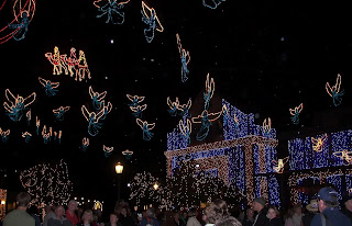 Next up, the Osborne Lights in the Streets of America in Disney's Hollywood Studios - They start putting these puppies up in Sept/Oct, so I can literally count on one hand how many times we've actually seen this section of DHS without them, but they don't get turned on until Christmas time. Donated from Jennings Osborne, a lawyer from my home state of Arkansas, who used to have them up on his house, but, after numerous lawsuits from his neighbors because of the heavy traffic they produced, was forced to take them down. They are pretty much the same displays he kept around his house. Mr. Osborne has passed now, but the tradition of the Osborne Lights is alive and well! They have since changed them all to LED's and added music synchronization, but it only enhanced the display. It also snows during the lights (ONLY DON'T TRY TO EAT THE SNOW - IT'S SOAP! I wish I had a dime for everytime I saw someone stick out their tongue to catch one!).